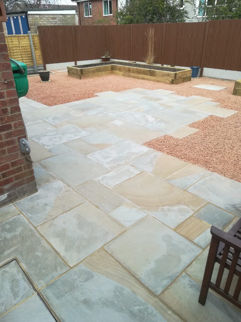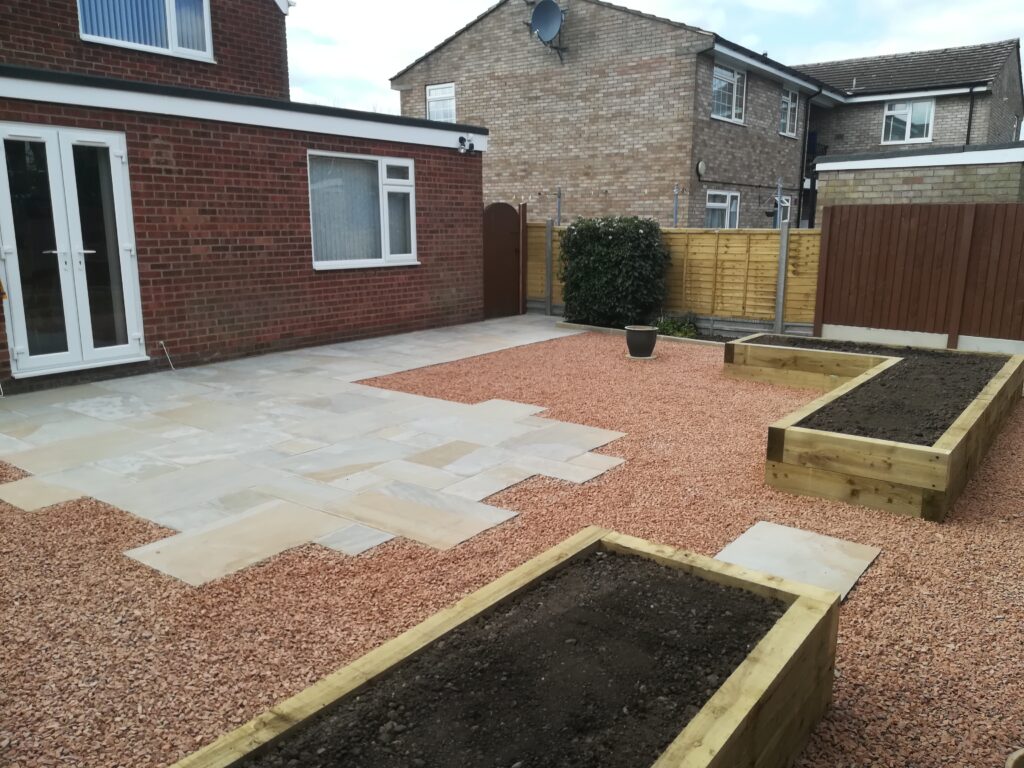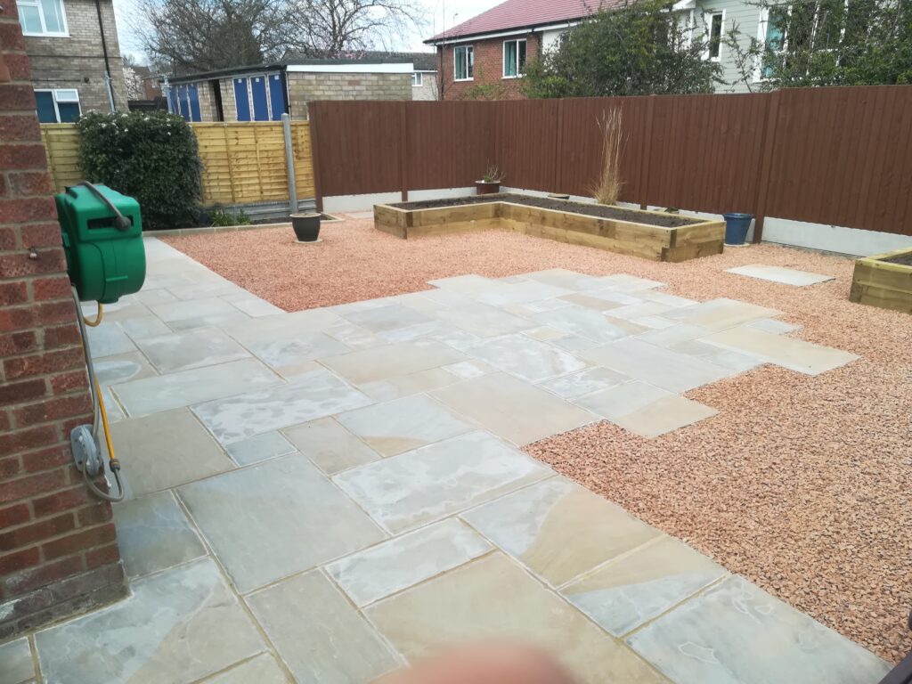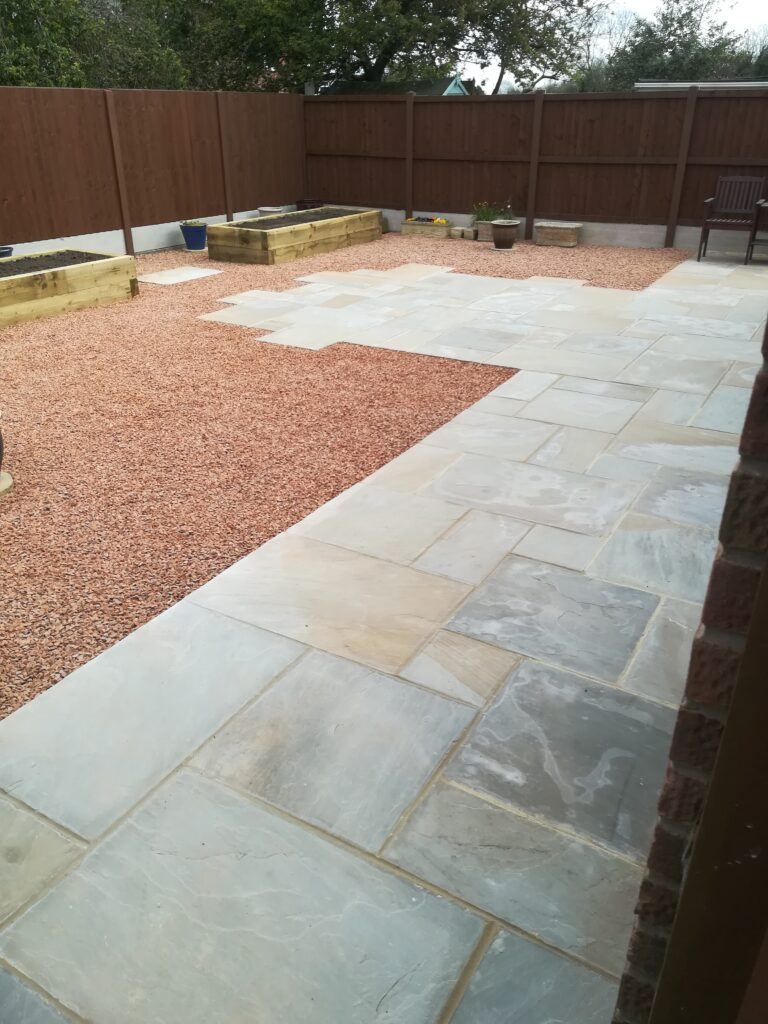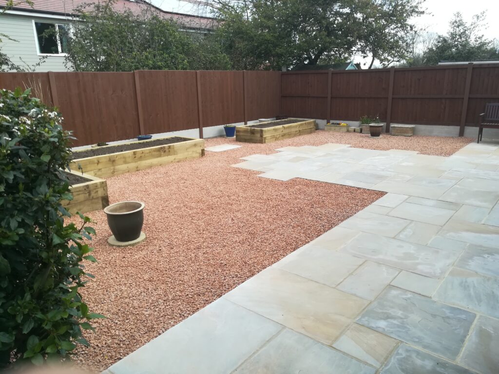 It included supplying and laying Indian sandstone paving, scree area, new timber fencing and raised boarders constructed of timber sleepers filled with top soil. He cleared away all of the old materials, including some garden pots and furniture, and he protected the access drive from the front of the house.