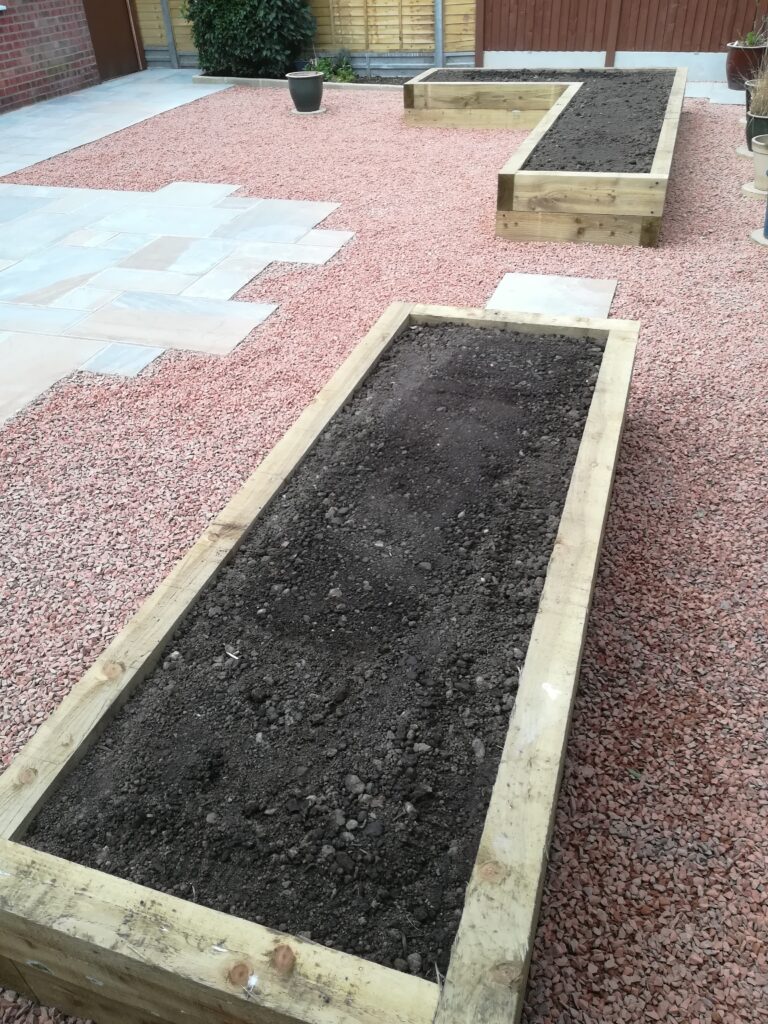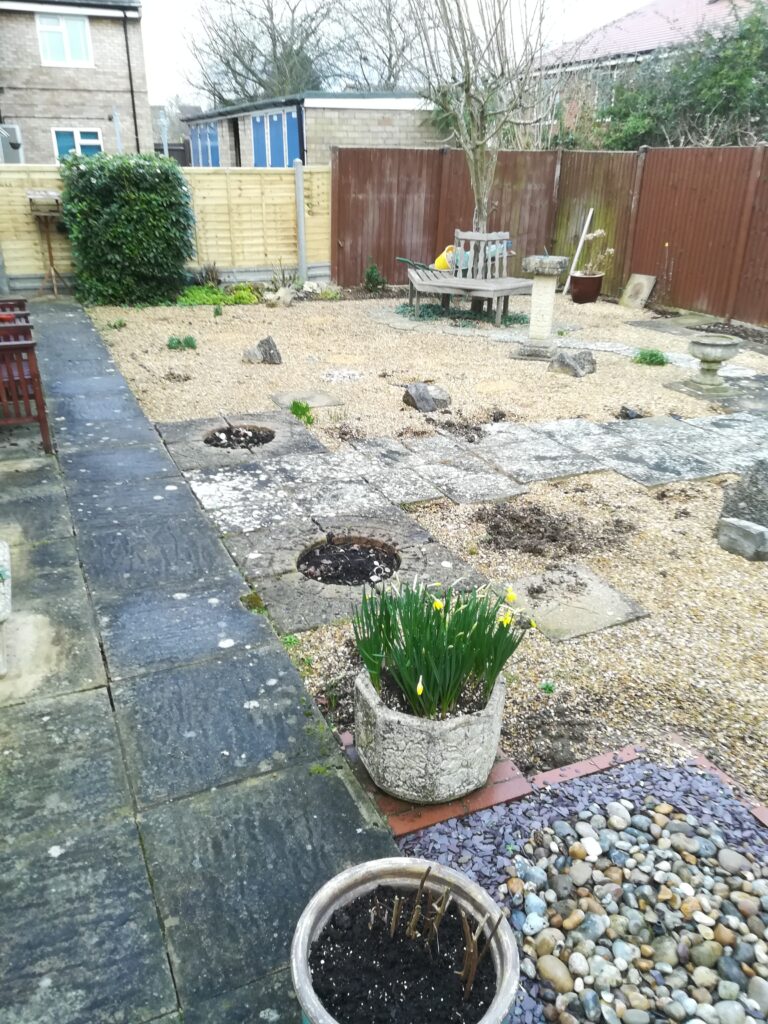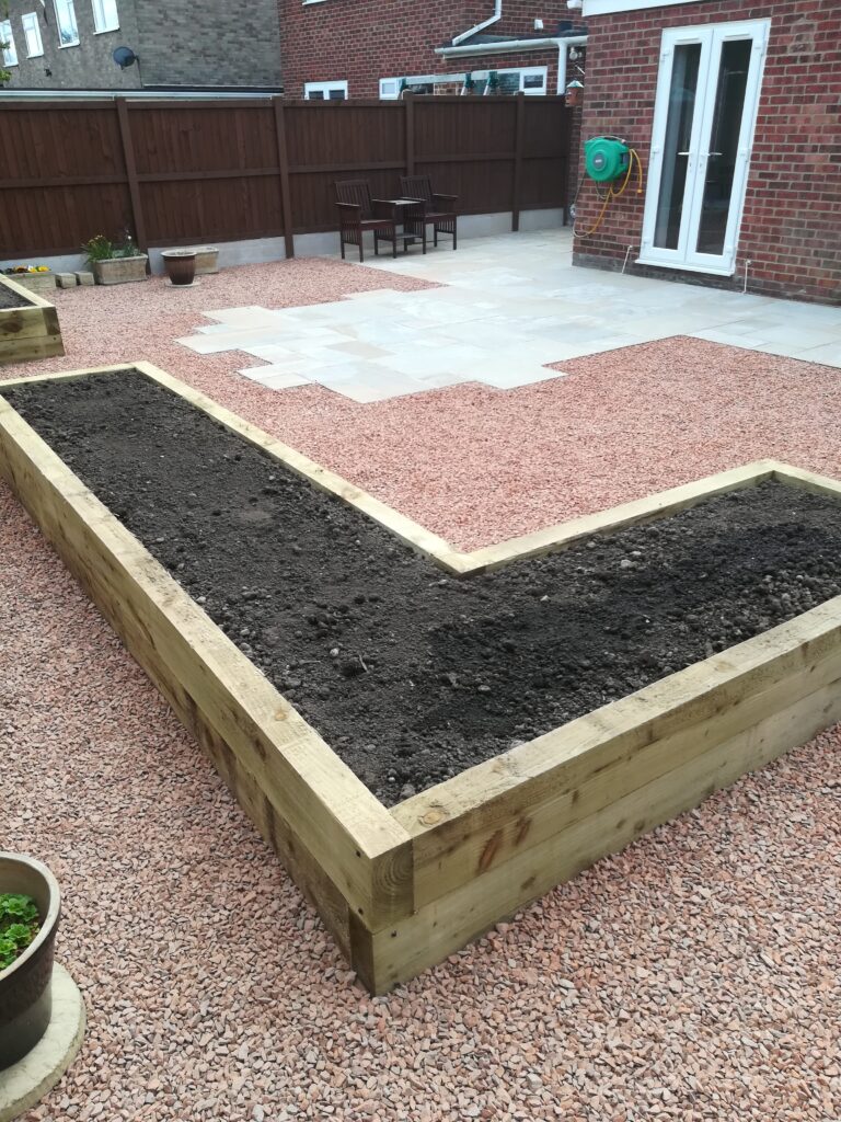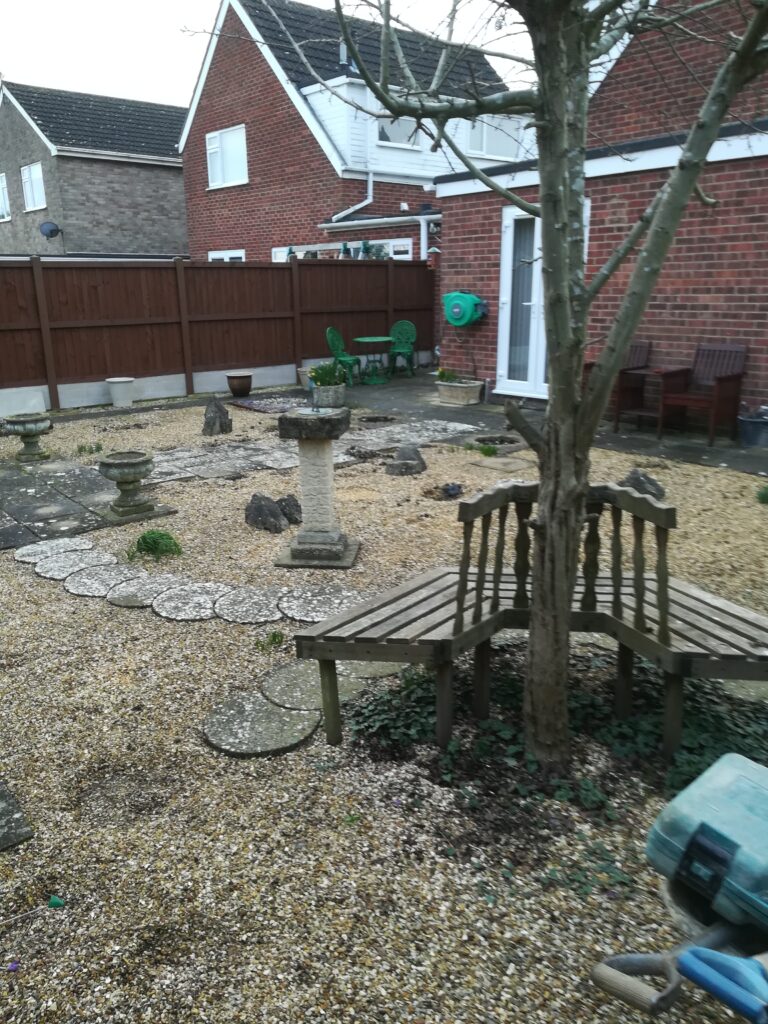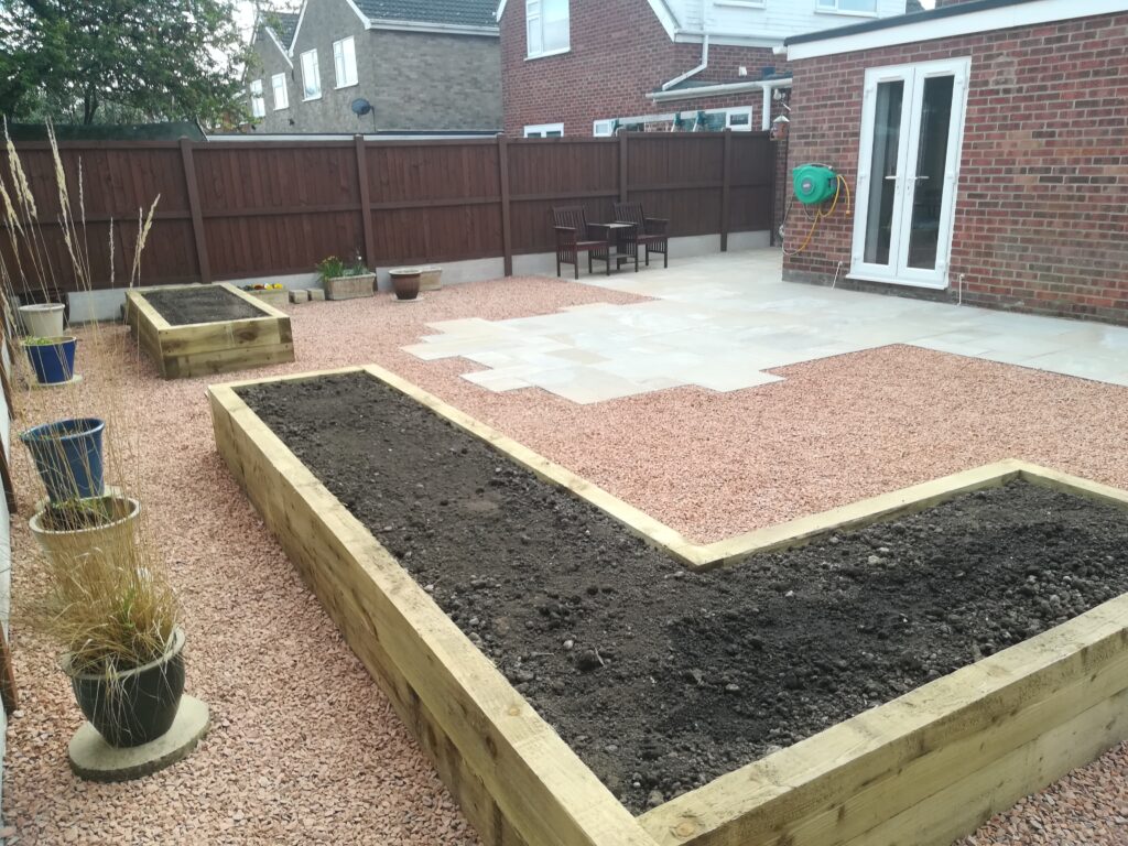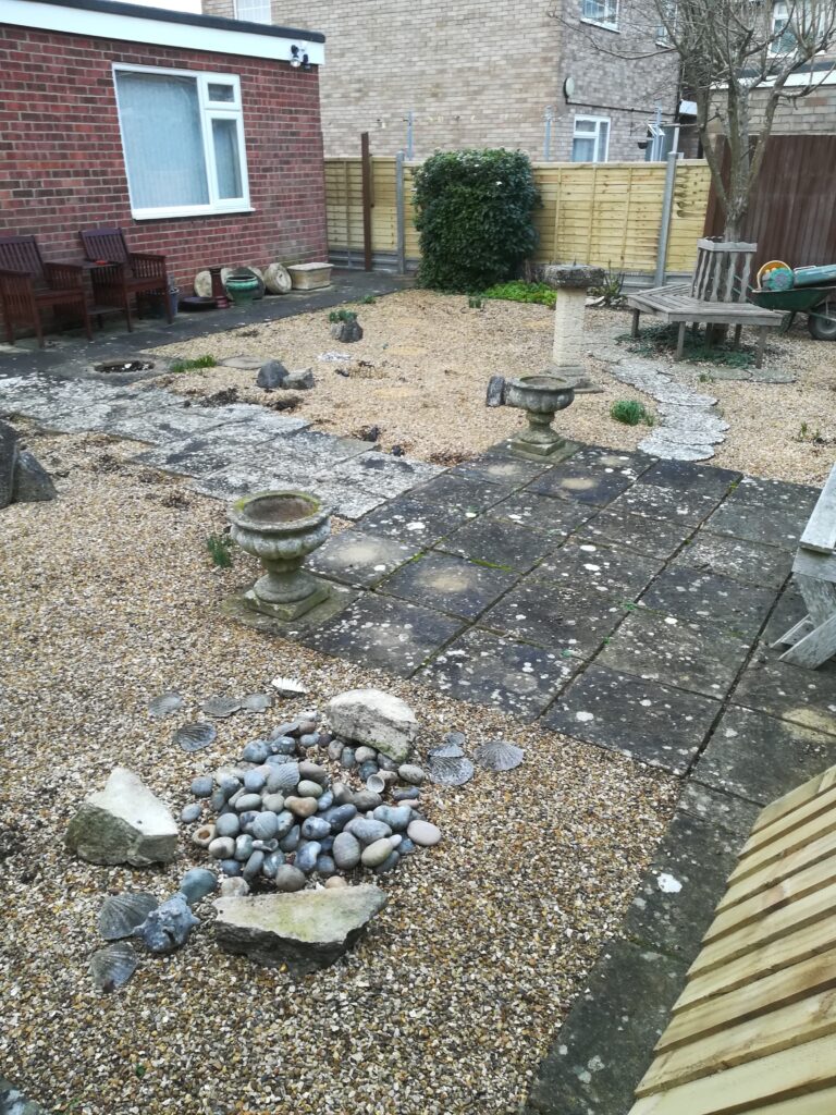 It included supplying and laying Indian sandstone paving, scree area, new timber fencing and raised boarders constructed of timber sleepers filled with top soil. He cleared away all of the old materials, including some garden pots and furniture, and he protected the access drive from the front of the house.